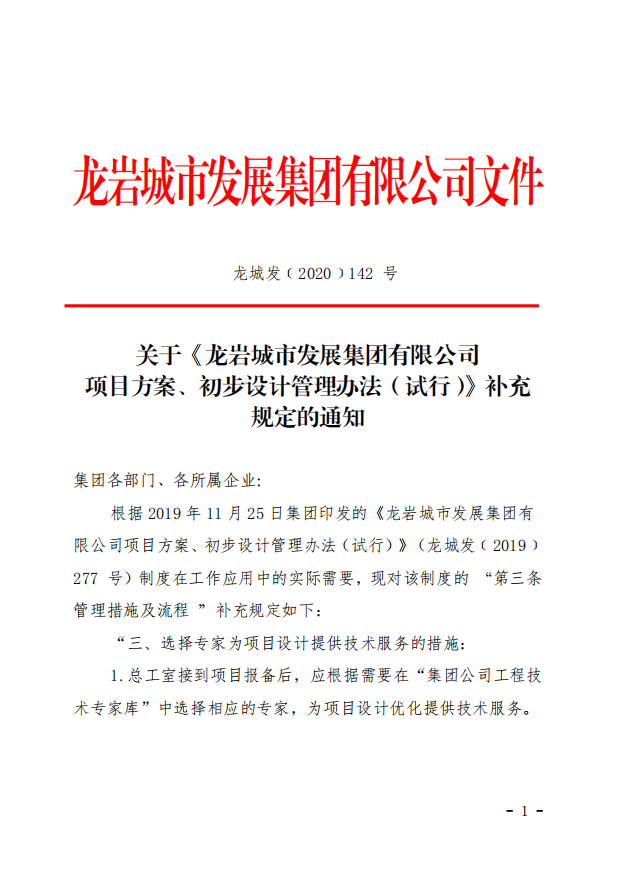 關(guān)于《龍巖城市發(fā)展集團(tuán) 有限公司項(xiàng)目方案、初步設(shè)計(jì)管理辦法(試行)》補(bǔ)充規(guī)定的通知